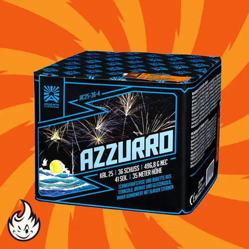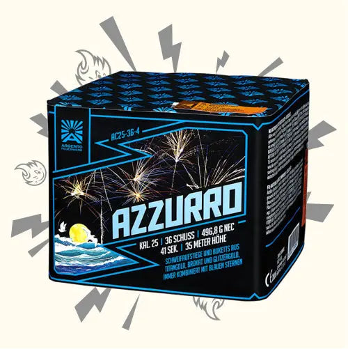 ARGENTO Azzurro - 36 Schuss Feuerwerksbatterie 25 mm mit 500g NEM und Glitzergold-Effekt