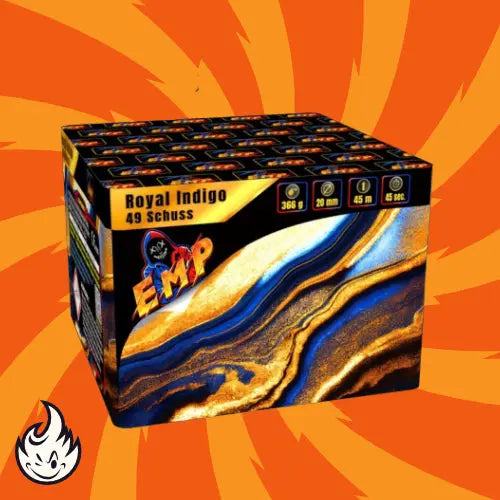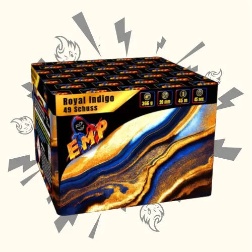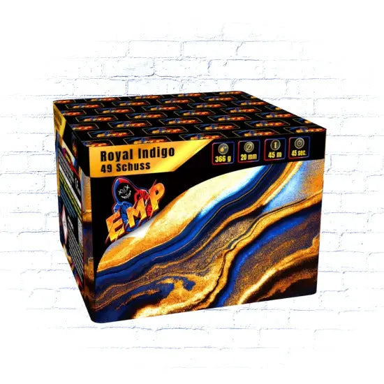 EMP Pyro Royal Indigo - 49 Schuss Feuerwerksbatterie mit satten Goldpalmen und Brokatbuketts. Top-Batteriefeuerwerk mit 45 Sekunden Laufzeit zum Bestpreis!