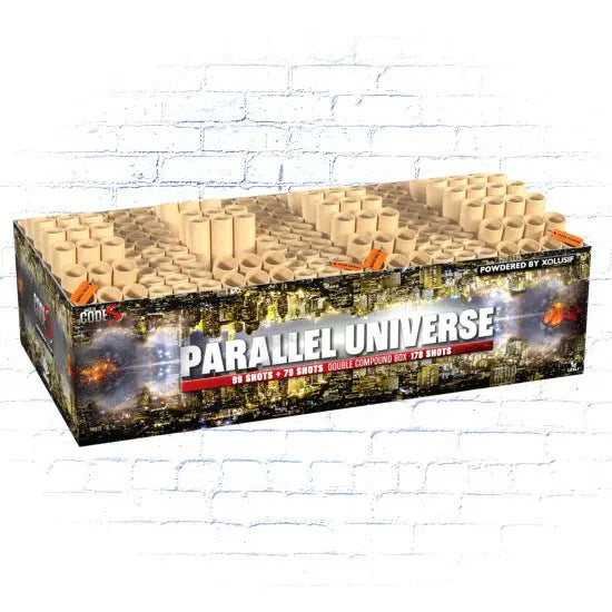 LESLI Parallel Universe CodeS - 178 Schuss Verbundfeuerwerk XXL mit verschiedenen Schusssequenzen und Fächerformen. Hier treffen Goldkronen auf bunte Peonien und Blinksterne in rasanter Schussfolge. Ein absoluter Traum am Nachthimmel. Powered by XQlusif