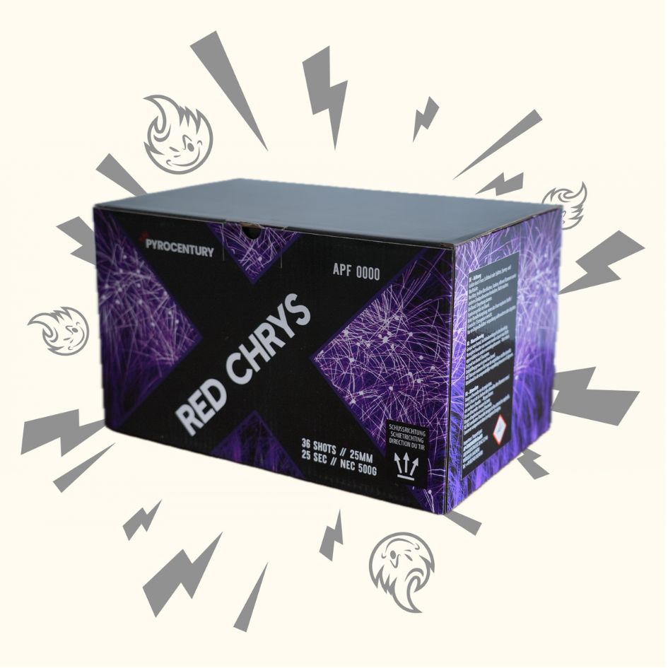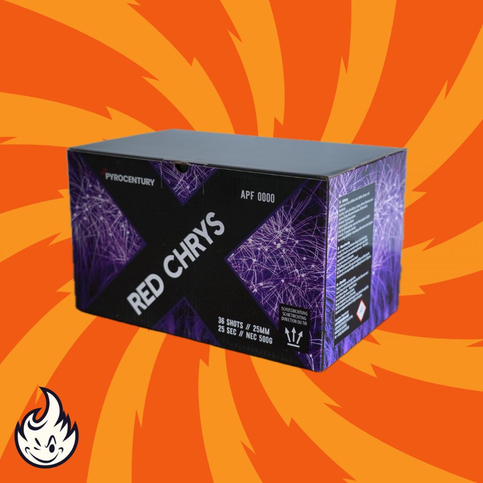 Pyrocentury Red Chrys - 36 Schuss Fan Feuerwerksbatterie 25 mm mit riesigen Crackling-Feuertöpfen zu roten, brachialen Chrysanthenumsalven