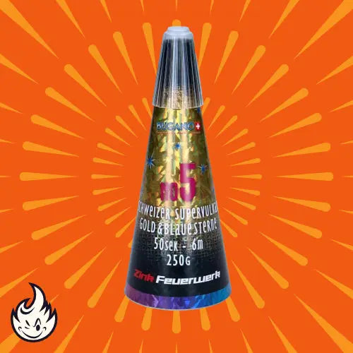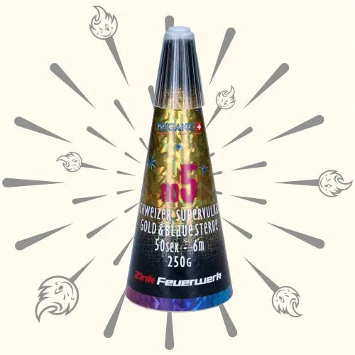 Zink/Bugano Schweizer Super-Vulkan No.5 250g NEM - 6m Steighöhe mit roter Bengalphase und platzenden Goldfunken mit blauen Blinksternen. Made in Switzerland